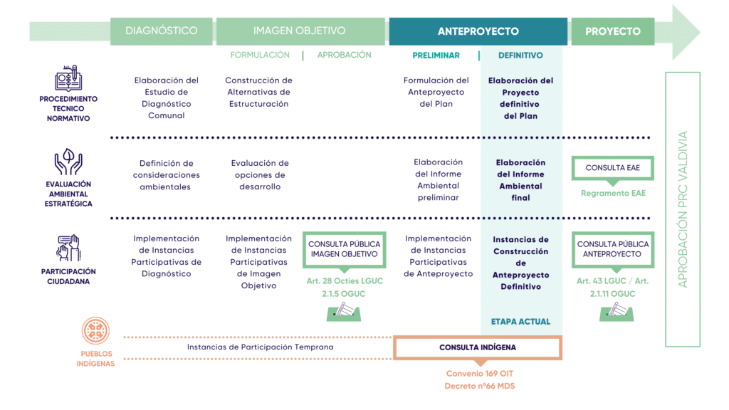 Durante esta etapa se implementará la Consulta Indígena de este proceso de actualización PRC Valdivia, en colaboración con personas y organizaciones indígenas de la comuna, conforme al convenio N°169 de la OIT y el Decreto N°66 del Ministerio de Desarrollo Social (MDS). Esta busca llegar a acuerdos acerca de las medidas propuestas por el PRC, asegurando un diálogo respetuoso y basado en derechos.